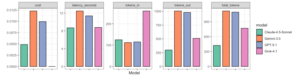 - Input tokens are almost identical for GPT-5.1, Gemini, and Claude. The prompt is short and shared, so that makes sense. Grok logs a much higher input token count (260) for the same prompt, which is a tokenizer difference, not a content difference.