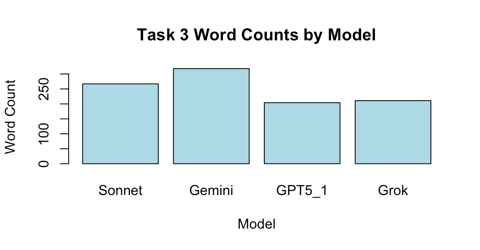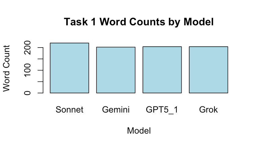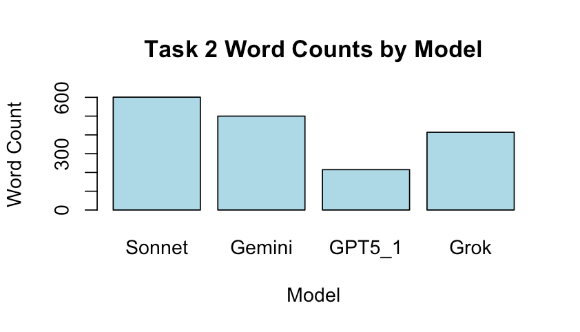 That visual pattern matches what you felt reading the essays: Claude is concise, Grok more moderate, GPT-5.1 and Gemini more expansive.