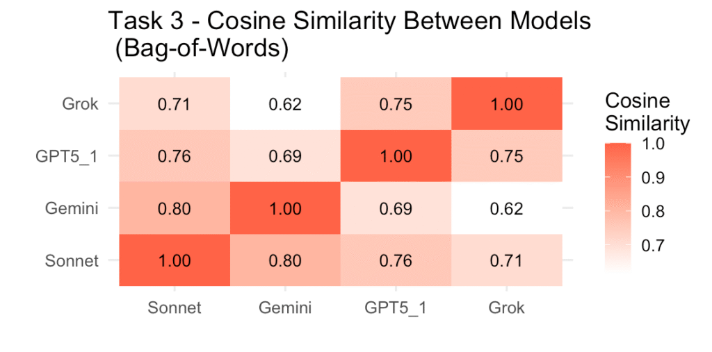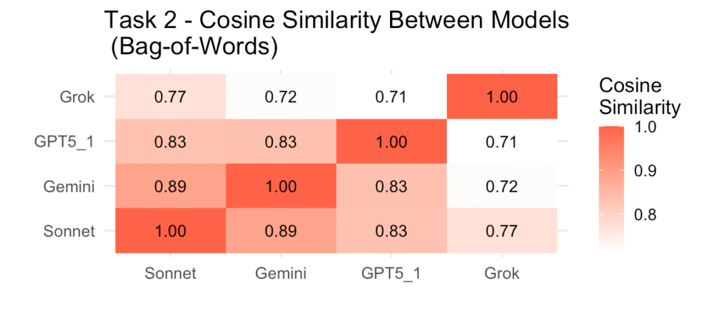 GPT-5.1 presents the material like a summary from someone who teaches the topic often. Claude folds the explanation into a smoother narrative, almost like it wants to make sure the reader doesn’t feel rushed. Gemini brings more names into the picture and restates concepts in multiple ways. Grok moves through the subject with a firm stride and uses stronger phrasing. The content aligns almost perfectly across the models, but the delivery shows their personalities with more clarity than any similarity score can show.