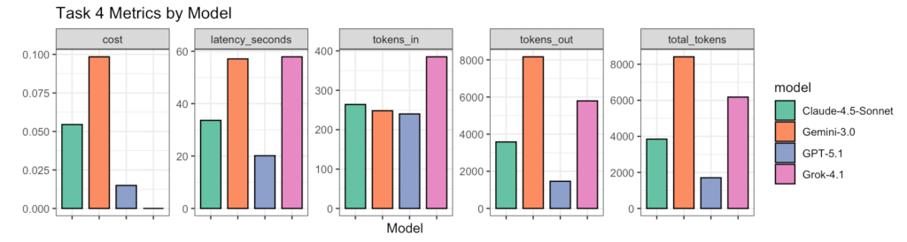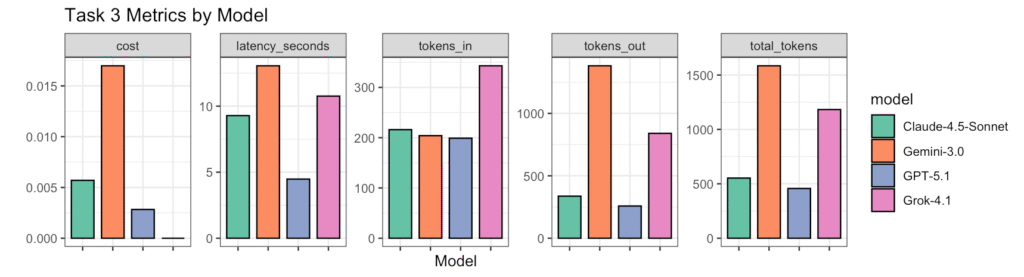 Below is a plot summarizing the numbers from Task 1. And yes, Gork 4.1 cost is $0, but that’s becuase it’s currently free on OpenRouter.