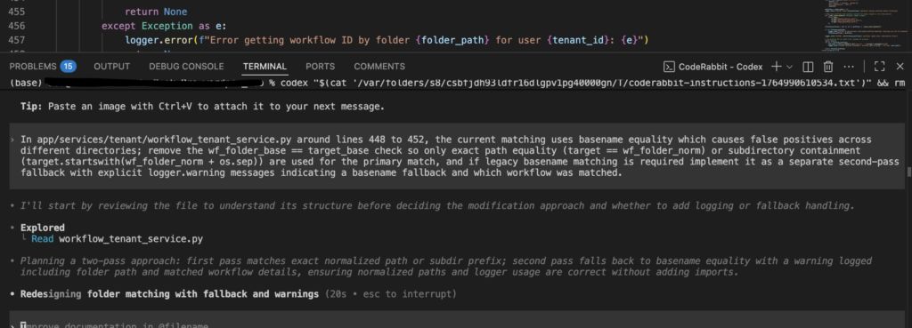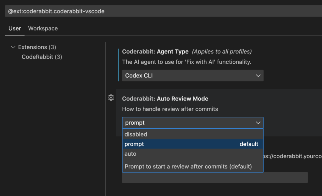 Next up for me was to use CodeRabbit in VS Code. You download the plugin, log in (you’ll be sent to their website) and you are ready to go. Well, almost, you need to go into Setting and choose how you want to use CodeRabbit. Since I use Codex CLI, I picked that as the Agent Type to use when something needs to be fixed. There is also an extensive guide for VS code here: https://docs.coderabbit.ai/guides/use-vscode .