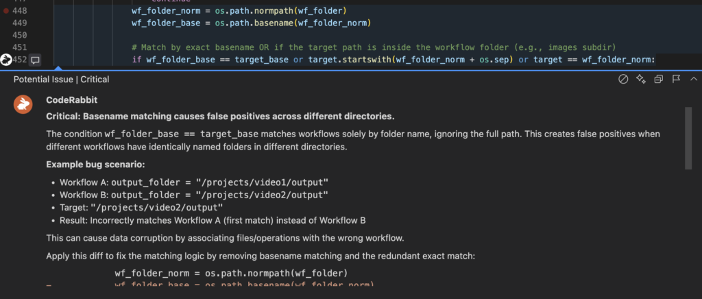 Then, if you click on the issue, CodeRabbit will send you directly to the line of code with the problem, explain what’s going on and give you suggestions on how to fix it. In my case, it looked like this: